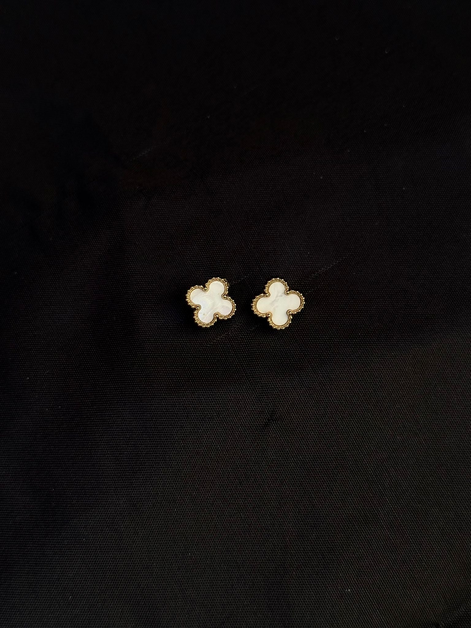 Boucles d'Oreilles Trèfle Nacre Blanche - Puces Dorées Élégantes